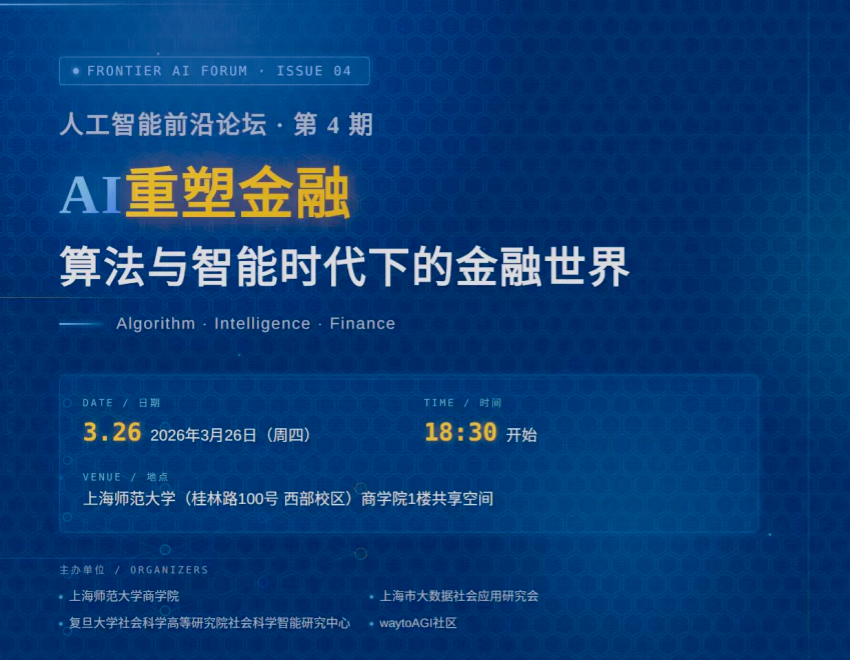 2026年3月26日晚,由上海师范大学商学院、上海市大数据社会应用研究会、复旦大学社会科学高等研究院社会科学智能研究中心及waytoAGI社区联合主办的“人工智能前沿论坛·第4期”在上海师范大学徐汇校区商学院108顺利举行。本期论坛以“AI重塑金融:算法与智能时代下的金融世界”为主题,汇聚了学界与业界的多位专家,共同探讨人工智能技术在金融领域的深度应用与未来趋势。论坛开场由上海市大数据社会应用研究会副秘书长李阳主持。李阳副秘书长介绍了本期论坛的背景与意义。他指出,随着大模型与多模态技术的快速迭代,金融行业正经历从“数字化”向“智能化”的关键跃迁,如何构建适应AI时代的金融架构、风险体系与人才能